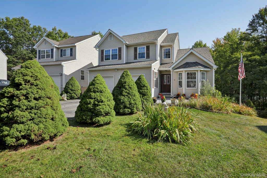 Welcome to this beautiful single-family home, originally built in 2002 and thoughtfully updated in 2022. Offering over 2,900 sq. ft. of living space, this residence combines modern upgrades with a serene setting in an established HOA community ($80/month lawn service). Step inside to find soaring 17’ cathedral ceilings, an open layout, and abundant natural light. The first floor features an updated kitchen with LG stainless steel appliances (2022), updated baths, and a spacious living area with sliding doors giving you access to a low maintenance trex deck. From the deck, enjoy sweeping views of the surrounding landscape, a fenced yard, and the peaceful backdrop. The second floor includes a large primary suite with an ensuite bathroom, two additional bedrooms, and a full bath. A fully finished walkout basement provides even more living space, perfect for recreation, work, or guests. Additional highlights include a new roof, windows, and a two-car garage. Located on a premium cul-de-sac lot in a historic Orange County village of Washingtonville - just 50 miles from NYC—this home offers convenience and comfort. Commuters will appreciate easy access to buses to NYC (5 minutes), NJ Transit trains (10 minutes), and Metro North’s Beacon Station . Nearby are shopping centers, Woodbury Commons, Bear Mountain, hospitals, and more.