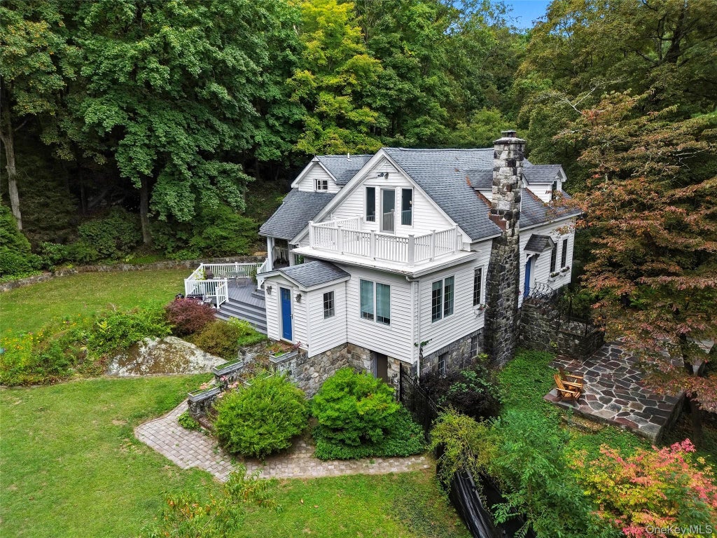 1930s Cape Cod Revival Colonial in the Lake Woodrock Community - Your own private retreat nestled among mature trees, natural outcroppings, and a stones throw away from the lake with seasonal views. This is an ideal home if you are seeking a peaceful, countryside feel and under an hour from NYC, wonderful for everyday living or the the perfect weekend country residence. A home that seamlessly blends architectural details with modern comforts, creating a warm, inviting atmosphere that exudes character and charm. Set on a peaceful country lane across the road from lake, there is a graceful curved paver driveway winding up to the residence, flagstone and slate walkways, stone walls, perennial gardens, and natural rock formations enhance it's visual appeal. A magical space invites you to sit, relax, and marvel at the natural beauty surrounding you. There is a flexible first-floor layout offering a variety of living options, including a bonus room that could serve as a fourth bedroom. The spacious kitchen opens to the dining area, with two sets of double doors leading to the expansive deck—ideal for outdoor entertaining, showing off views of the surrounding landscape. There is a sitting room which could be transformed into a formal dining space, and a cozy music room with a door to the deck, also could function as potential office space. The living room features a striking riverstone fireplace and charming original details, creating a welcoming atmosphere. An adjacent office with its own garden entrance adds convenience, and versatile for extra sleep space if needed. Off the foyer, the iconic cheerful vintage yellow powder room adds nostalgic charm. Upstairs, you'll find three bedrooms, two full renovated bathrooms, and a convenient laundry area. The primary suite boasts vaulted ceilings and a private bath, while a second large bedroom offers access to a roof deck overlooking the gardens. Both bedrooms are equipped with split duct cooling for added comfort. The lower level includes a walkout to the garage, a finished room perfect for a home office or studio, and ample storage and utility space. The fenced yard, surrounded by nature, offers privacy and tranquility. There is a small annual fee for maintenance of the lake and its beach, kayaks, paddleboards and swimming allowed, nature lovers, there are occasional visits from eagles, ducks, herons, otters and turtles; anglers may catch small sunfish or catfish. Taxes under 15K.
